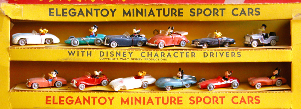 The MINIATURE SPORT CARS line featured both the Disney (Mickey, Donald, Pluto and Goofy) and Popeye characters (Popeye, Olive, Bluto and Wimpy) in a variety of sports car-type vehicles. Each character appeared in three different cars -- and there were up to 12 different types of racing and sports cars of the day, as well as a Volkswagon Beetle and a Jeep. The automobiles represented included what appears to be a wide range of late-1950s foreign cars, including: Formula One-type racing cars, a Mercedes, Jaguars, BMWs, and Alpha Romeos. All the cars and the small character figures were hand painted, and the cars came in different colors.