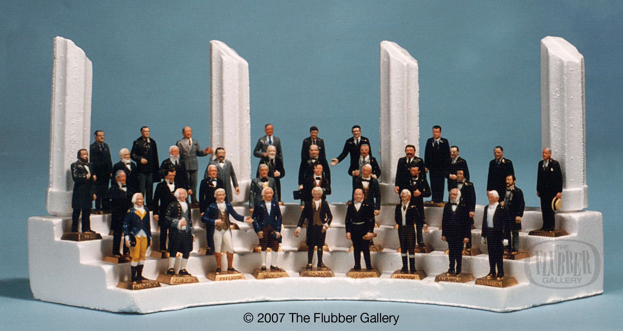 The most common version of the Marx Presidents sets is the supermarket promo shown above. It may have also been available as a gas station promo as well. This set was available via an in-store promotion where a new figure was released each week. The set was also sold complete as a mail-in offer. The complete set included all painted Presidents up to Nixon, including Lyndon Johnson and John F. Kennedy. The unique multi-tiered Styrofoam base with columns was provided to display the entire series.